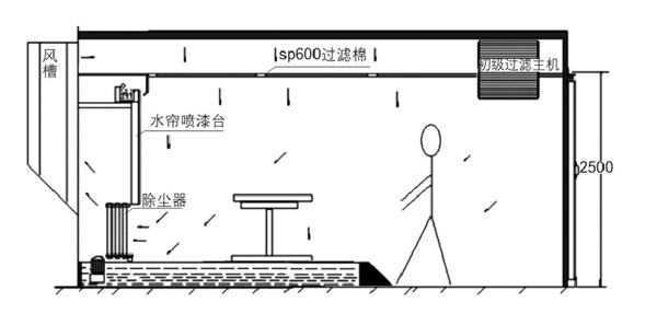 噴漆時,外部空氣經過初級過濾網后由風機送到房頂,再經過頂部過濾網二次過濾凈化后進入房內,房內空氣采用全降式,以0.2-0.3m/s的速度向下流動,使噴漆后的噴漆微粒不能在空氣中停留,而直接通過底部出風口被排出房外。